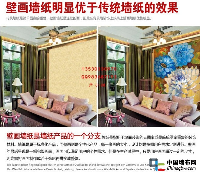 ★大型壁画高环保,采用纳米水性技术。 ★大型壁画具有呼吸功能,确保透气、防潮、防霉变性能良好。 ★大型壁画光稳定性强,色泽自然典雅,无反光感,具有极好的上墙效果。 ★大型壁画可重复张贴,产品更新时可直接张贴在原有墙纸上。 ★大型壁画彰显尊贵,相当多的花型为手工绘制,并克服了传统壁纸刺眼的浮华效果。 ★大型壁画版本丰富,版本涵盖多种风格(现代、欧式、中式、乡村、简约、油画、卡通等)自由组合。 ★大型壁画应用广泛:工装家装酒店、豪宅、KTV、会展、俱乐部、别墅、家居、写字楼装饰 ★大型壁画花型更新快:款式和花型要求非常前卫,一般新款壁纸生产周期最多为两年即不再生产,这样就会不断有特价推出及新款花型上市,充分保留客户装修风格的个性化效果。 ★大型壁画个性强。丰富多样的图案大面积的覆盖墙体,绝对可以带来全新的视觉效果。尺寸可随意定制,满足不同空间需要,也可根据您的喜好定制图案,满足个性化需求。 ★大型壁画质地好。产品具有其他传统壁画墙纸不同的优势,由于产品中间有防水涂层,所以具有抗水性,可用湿毛巾轻轻擦拭,不怕光照,不怕高温,不变色。 ★大型壁画肌理感强。其表面经过与普通壁画所不同的工艺处理,加强了表面肌理效果,触觉视觉效果佳。 ★3D大型壁画无接缝。综合了传统印刷画与墙纸的优点。由于纹理采用特殊处理,拼贴后不显接缝,以及厚实的质地,特殊的表面肌理,是整个画面体现得更加完美 |