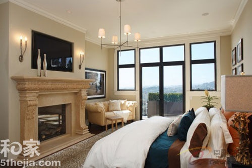 正对着床有个能带来温暖的壁炉,精致的欧式古典造型,是一面不用经过多于修饰的电视背景墙,电视机正好镶嵌在壁炉上方的墙壁之中,2段设以壁灯增添美感。