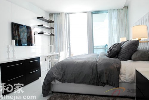 小户型的卧室,也不忘设计一个享受快乐娱乐时光的电视区域,契合素雅的室内配色,电视背景墙设计采用了黑白色,黑色电视柜紧贴墙壁,有上角的三个平行搁板既是收纳区又是种装饰。