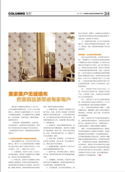 3、墙布的拼缝优势。其他同行业均无法拼接,目前在国内美家美户是唯一一家能拼缝的企业
