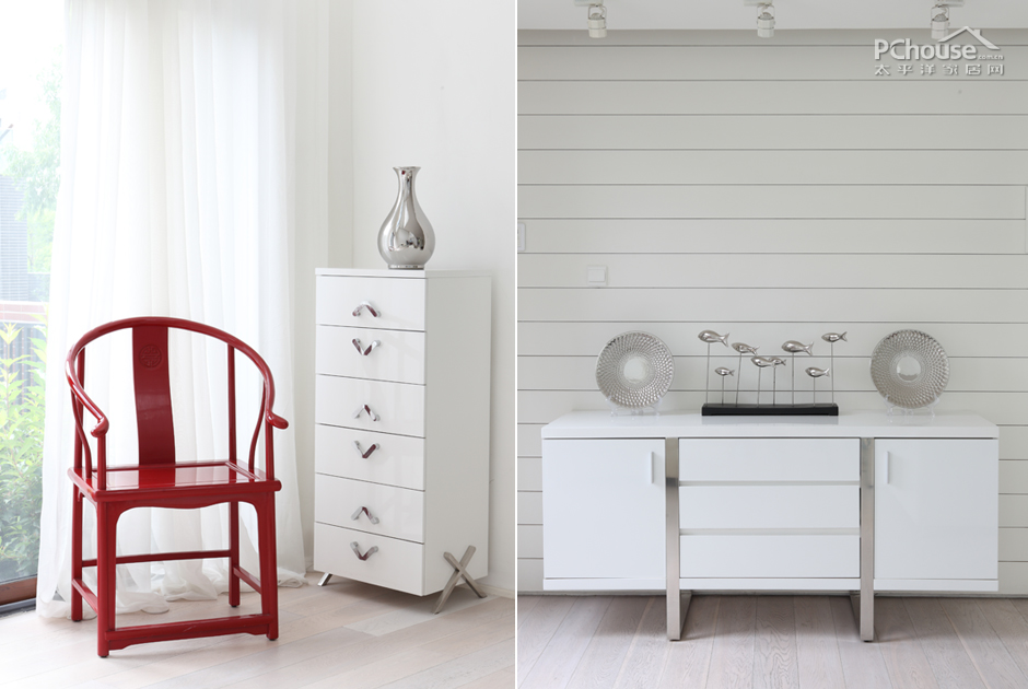 乳白色:沙发上堆满了印花棉布的靠垫,茶几上花瓶中的紫色郁金香与搁板上的小花,一高一低,相互呼应,既养眼又使人不自觉地联想到温暖的春季