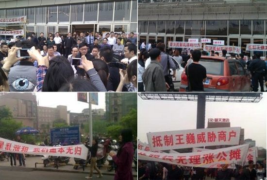 近期微博中有爆料称广西柳州市某全国连锁的知名卖场被经销商包围,从图片中可以看到,卖场的玻璃上贴满了大字条幅,“黑心商场”、“强行暴涨租金”等字样随处可见。据了解,事件起因源于该卖场柳州店总经理因商场租户未接受大幅上涨的租金及公摊面积,就对部分商家实行撤场处理,并威胁其他商户,由此引起了冲突围店。最终,此次事件以该店总经理出面当众向三百余家商户道歉,并承诺废除无理上涨的公摊面积暂时告终。4月10日,该店面已恢复正常营业,同时记者了解到,事件的最终结果是该店总经理辞职,卖场总部承诺今年不涨租、同时也在协商与商户签订长期的租约合同,事情至此基本平息。
