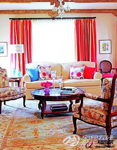 设计师非常注重布艺的装饰。“我发现客户非常喜欢一种布艺,就是客厅沙发靠枕上的有大花和蝴蝶图案的布艺。”这成为设计师色彩设计的最初灵感来源。设计师搭配了带有薰衣草图案的蓝色和红色靠枕,形成了巧妙的色彩组合,虽然不是典型的对称式,但效果却相当出众。“这样的搭配会让色彩更灵动,粉色蔓延到空间的各个角落,而蓝色也会跳跃出来,但却不显得突兀。”