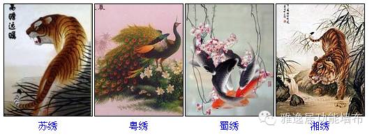 从欣赏的角度来看,苏绣作品的主要艺术特点为:山水能分远近之趣;楼阁具现深邃之体;人物能有瞻眺生动之情;花鸟能报绰约亲昵之态。苏绣的仿画绣、写真绣其逼真的艺术。苏绣效果是名满天下的。在刺绣的技艺上,苏绣大多以套针为主,绣线套接不露针迹。常用三、四种不同的同类色线或邻近色相配,套绣出晕染自如的色彩效果。同时,在表现物象时善留“水路”,即在物象的深浅变化中,空留一线,使之层次分明,花样轮廓齐整。因此人们在评价苏绣时往往以“平、齐、细、密、匀、顺、和、光”八个字概括之。----中国墙布网