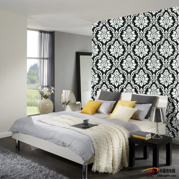 黑白大马士革的图案,宛如浮雕般的立体感。适合用于卧室、客厅局部,可搭配灰白色系的家具。